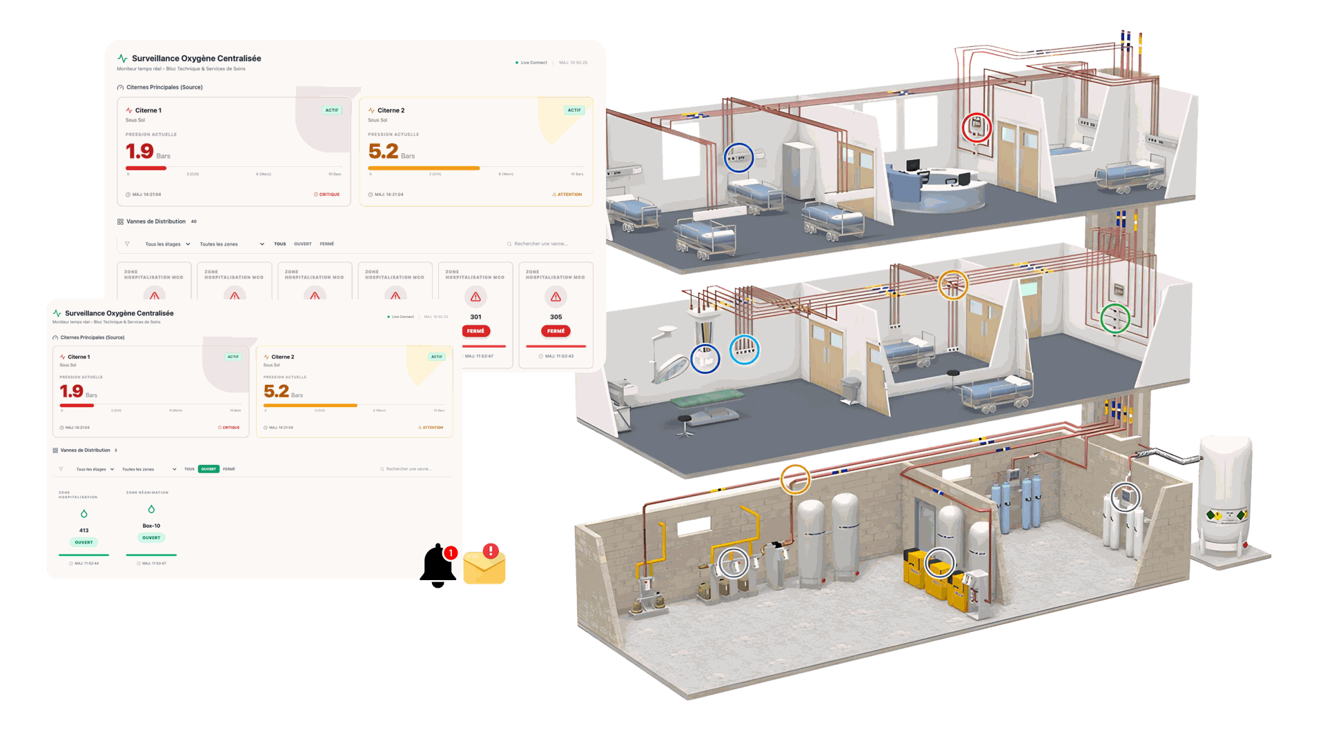 Ensure uninterrupted, safe, and efficient oxygen delivery across your healthcare facility with a real-time, centralized monitoring solution. Our Oxygen Monitoring system provides continuous visibility into oxygen flow, pressure, and system performance through connected sensors, secure gateways, and an advanced monitoring platform.